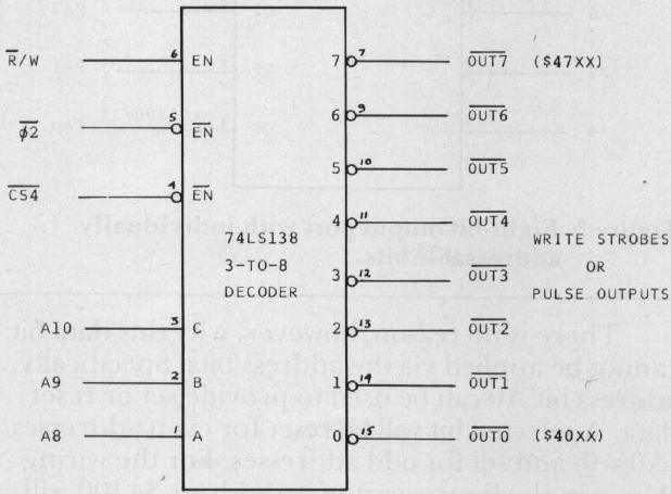 In this case, the ø2 clock signal is not optional since write strobing action is accomplished with this signal in 6502 timing. The application of the low-true version of the ø2 delay in the individual outputs and an acceptable amount of write hold-time loss. (See the early Nuts & Volts columns on read/write timing).