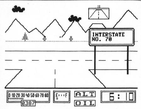 The Roadtrip program is for Apple II computers and makes excellent use of high resolution, color graphics. The screen displays show a car dashboard and the views through the windshield and rear view mirror (see Figure 1). The dashboard has a speedometer, odometer, gas gauge, clock, alternator, and oil warning lights. The views through the windshield and rear view mirror change each time the car moves. The programmers of Roadtrip paid careful attention to every detail. For example, the sun comes up in the morning, and the stars appear at night.