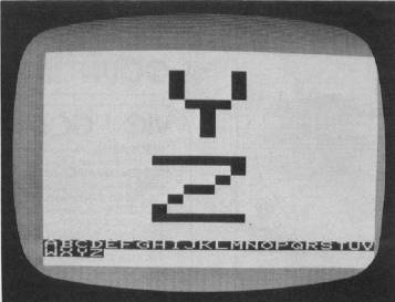When the program starts, it's in the Alphabet mode. A large letter "A" appears in the middle of the screen, and a small reverse video "A" appears near the bottom. Each time Jesse presses the space bar, the next letter in the alphabet replaces the previous one in the middle of the screen, and the new letter is added to a growing alphabetic sequence at the bottom.