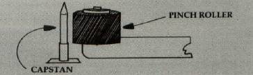 The tape is pulled through your drive at a uniform rate. The computer would not be able to load your programs from the tape drive if the rate deviated much from the norm. Inside the tape player are a capstan and a pinch roller (see illustration). When the PLAY button is pressed, the capstan revolves and the pinch roller holds the tape firmly against the capstan. The roller is made of hard rubber, but left pressed against a motionless capstan, it can be deformed.