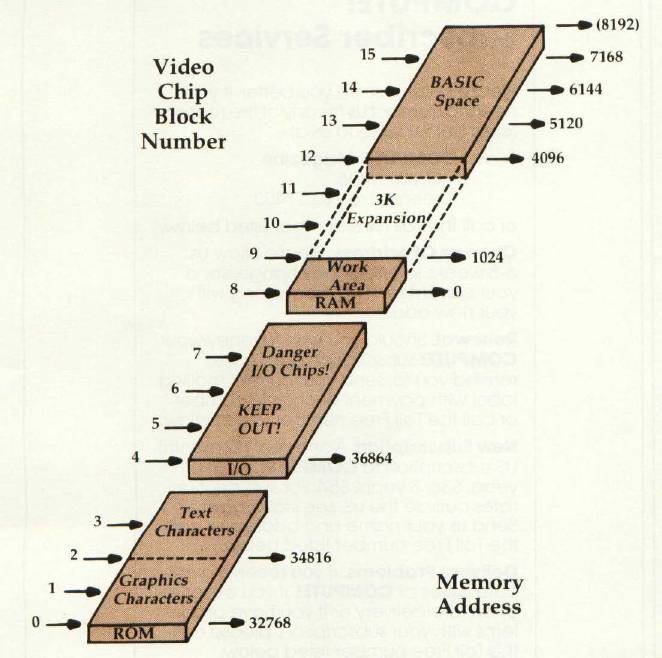 The video chip sees only the memory shown above. Even if you have expanded your computer to include lots of extra RAM above address 8191, the chip can't see it. The chip sees only the character ROM, in blocks 0, 1, 2, and 3; and the lowest 8K of RAM (in blocks 8 to 15). Blocks 4, 5, 6, and 7 would look at the Input/Output area, but take my advice: don't do it – no good will come from these addresses.