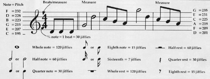 Don't be concerned that some shafts go up and some down, or that notes may be joined with arcs or bar-like flags. These exist only to confuse computer people. You need be concerned only with the duration of a note (filled in or open, whether it has a shaft or not, and the number of bars or flags. By the way, a dot after a note increases its duration by 50 percent) and its pitch (as determined by its altitude on the staff). Any pitch of less than 128 is a rest or silence.
