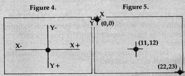 In the article "VIC Bitmapping," x coordinate points begin at the left of the screen, y coordinate points begin at the top of the screen (see Figure 5). Coordinate 0,0 thereby becomes what computerists call the HOME position, the upper left corner of the screen. Screen positions are plotted by raising or lowering the x and y coordinates. Figure 5 illustrates plotted examples where the x,y coordinates are 11,12 (middle of the screen), and 22,23 (lower righthand corner).