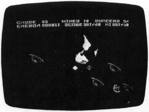 One of the most challenging aspects of the game is learning to control your spaceship. You can set your course, then aim and fire your lasers independently — all with the joystick and fire button. The result is a very versatile craft, but one that's difficult for beginners to handle. The secret is that when the fire button is depressed, the joystick controls the direction of the lasers. When the fire button is up, the joystick controls the ship. It sounds simple, but practice is required.