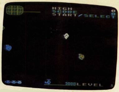 Press the SELECT key to choose one of three levels of play. The higher the level, the more asteroids you must dodge. Press the START key to energize the first of your three chopperoids. It will appear in blue on the heliport at the bottom center of the screen, while your remaining chopperoids stand by in the lower-left corner. Maneuver the chopperoid with a joystick plugged into port 1. You have full control in any direction. If you have a trackball, you may find it to be a better controller for this game than a joystick.