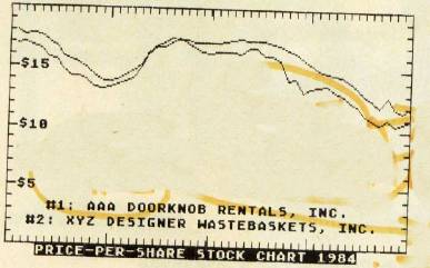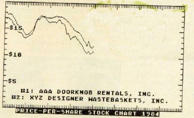 Next, the GOSUB 1500 at line 440 plots the stock prices for the second company: Then, ZA$ is redefined in line 460 as "#2: XYZ DESIGNER WASTEBASKETS, INC.", and this label is drawn. Lines 480, 500, and 520 redefine ZA$ three more times to display dollar labels on the chart. The GOSUB 1160 added onto the ends of all these lines sends the program off to the text subroutine.