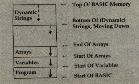 Let's talk for a moment about the string storage area. It's located near the top of available BASIC memory: above the program, above the variables, and above the arrays. Dynamic strings are placed at the top of this area. As more and more strings are created, they work their way downward. Often, many discarded strings will be left behind—Ebeneezer and his friends—yet no attempt is made to reclaim the wasted space.