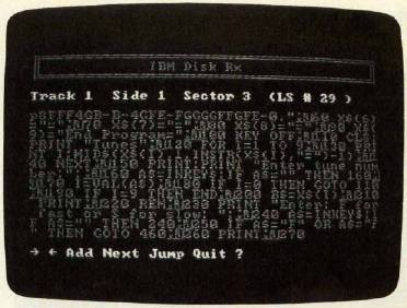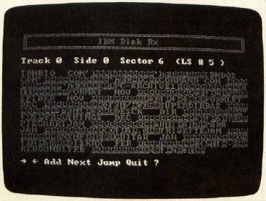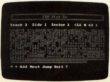 2. Call up IBM Disk Rx and start it running. When it's ready, insert the disk with the deleted file into the drive. By following the Disk Rx screen instructions, you can display sectors of the disk on the screen, one at a time.