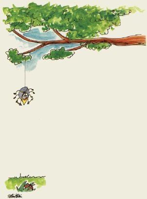 Guide Webster, the hungry tree spider, in his endless search for a square meal. Roving back and forth across his tree limb, he watches for bugs to appear in the grass below. When the time is right, he drops down on a strand of silk for a light snack, then climbs back up his web to look for more.