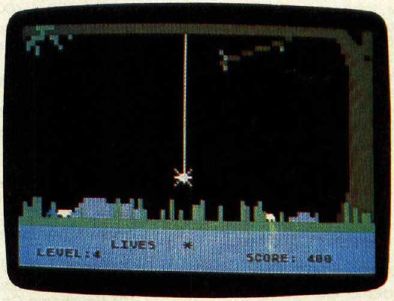 The 64 version (Program 2) is played with a joystick in port 2. The bugs and scorpion move across a sloping, multicolored lawn; at higher skill levels, colorful objects grow up to obscure your view of the ground. Play ends when your lives are used up or time runs out at the last skill level.