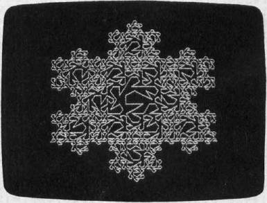Program 3 plots what Mandelbrot refers to as a "snowflake sweep." The generator, shown in Figure 2, was discovered by Mandelbrot. The segments are numbered zero through six, starting at the right. The program is basically the same as Program 1. The variables NC, C, SN, D, X, and Y represent the same values except that the direction D is numbered counterclockwise from the negative x direction. For each segment, the accompanying table gives the value of RD (relative direction), LN (length factor), and SD (flags indicating which side of the segment the generator is to be placed).