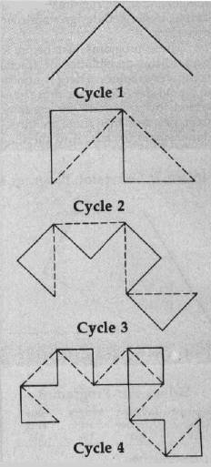 Many types of fractals are self-similar, which means that all portions of the fractal resemble each other. Self-similarity occurs whenever the whole is an expansion of some basic building block. In the language of fractals, this basic building block is called the generator. The generator in the accompanying programs consists of a number of connected line segments. The curves that the programs plot are the result of starting with the generator and then repeatedly replacing each line segment with the whole generator according to a defined rule. Theoretically, these replacement cycles would continue indefinitely. In practice, the screen resolution limits the number of cycles.