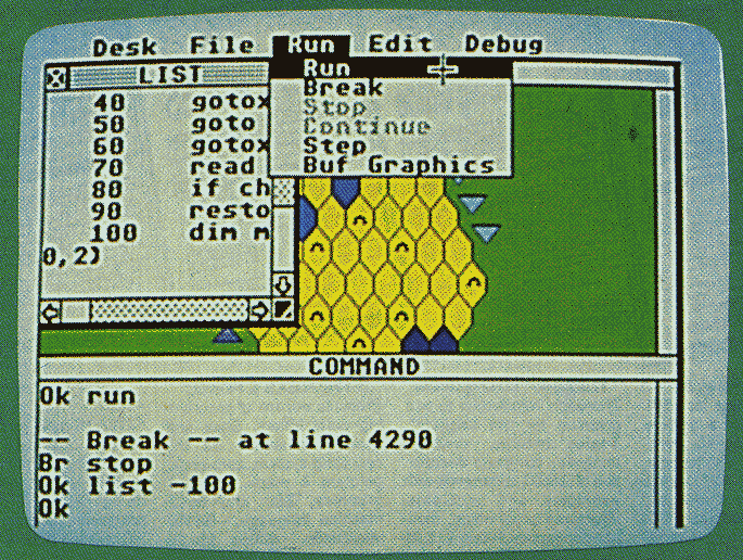 Macintosh BASIC, for example, offers several windows: a Command window to take your directions; two List windows, allowing you to have two different parts of the program onscreen at the same time; and an Output window which allows you to see the results of your programming. There are also programming tools that simplify your efforts. TRACE MODE, a debugging tool that can be switched on or off, highlights whatever line in your program is currently executing. The new BASICs also generally support the currently popular mouse environment, allowing you to create your own custom-designed windows, pull-down menus, and dialog boxes.
