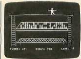 This version of Tightrope requires a joystick plugged into port 2, After you finish walking across the rope, you must repeat the performance while riding a unicycle. At successive skill levels, the acrobat alternates between walking and riding the unicycle.