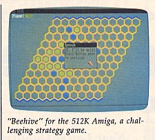 Steve MichelTo avoid getting stung in this delightful strategy game, you'll need to plan ahead. The original version of "Beehive" was written for the 512K Amiga. We've added fresh translations for the Commodore 64 (and 128 in 64 mode), Apple II series, IBM PC/PCjr, and Atari 400, 800, XL, and XE. The IBM PC/PCjr game requires a color/graphics card and BASICA for the PC, and Cartridge BASIC for the PCjr. The Atari version requires at least 32K of memory and a joystick. The Commodore version requires a joystick. The Apple II version requires a joystick and color monitor, and runs on any Apple II-series computer with either ProDOS or DOS 3.3.