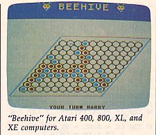 Atari Beehive (Program 3) requires a joystick and runs on any Atari 400, 800, XL, or XE computer with at least 32K of memory. Plug the joystick into port 1. Move the pointer over the cell you wish to occupy, then press the fire button to select it.