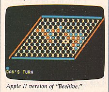 The Apple II version of Beehive (Program 4) runs on any Apple II-series computer, under DOS 3.3 or ProDOS. A color monitor and joystick are required. To select a cell, move the pointer onto it, then press the button.