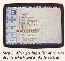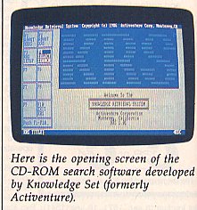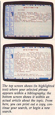 Many now claim that the CD-ROM is superior to any previous reference tool. To see why, let's take a brief walk through a search using the Philips/Grolier package. Installation of the system involves plugging a board into the IBM-PC, connecting the CD player cable to the PC, and turning everything on. Once you've loaded the search software (Knowledge Retrieval System, by Knowledge Set) from a floppy disk, put the CD into the drive and turned it on, you're ready to go.