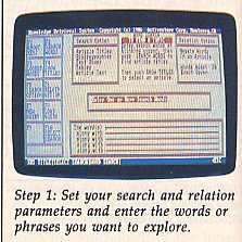 The first working screen of the system presents two sets of options. Search options let you look for desired words or phrases within article titles, bibliographies, fact boxes, article text itself—or anywhere in the encyclopedia. If you're cross-referencing two words or phrases to see if they have any relationship to each other, you can choose from several Relation options. For instance, you can find out if your selected words or phrases appear in the same article, the same paragraph, within a certain number of words of each other, or in the exact order. The fifth option here, which can save you some time, lets you negate a word that might appear within the phrase you're looking for, but which is actually another subject entirely. If you are doing a report on Martin Luther, negating the word King will prevent you from pulling articles you don't need to read.