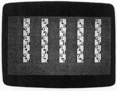 Except for the Amiga version of the game, all versions use the cursor control keys to move a pointer on the screen. When the arrow is pointing to one of the cards you wish to remove, press the RETURN key (on some computers, this is known as the Enter key). The arrow changes shape to let you know that you have selected a card. If you change your mind after selecting one, go to the card and press RETURN again. The arrow will return to its normal shape.