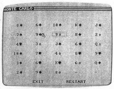 The Amiga version of Monte Carlo (Program 4) uses the mouse to select cards. To choose a card, move the mouse pointer to the first card and click the left mouse button. Then move the pointer to the other card and click again. The cards are removed and the other cards slide into place. If you wish to deselect a card, point to the selected card and click on it again. Press Q at any time for a new game.