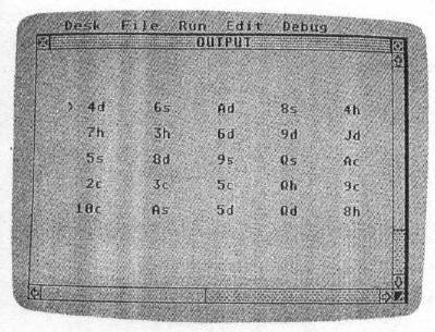 The Atari ST version (Program 7) works in any screen resolution. Use the cursor keys to move the arrow pointer. Press RETURN to select a card. Because of an oddity in ST BASIC, the game board will occasionally be displayed incorrectly. If the board looks strange to you, select a nonmatching pair of cards. The board will be displayed correctly. Press Q at any time for a new game.