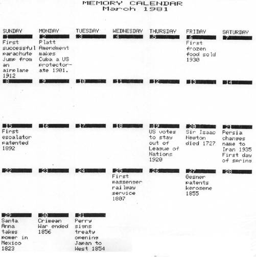 Figure 1. A typical Memory Calendar printout. MEMORY CALENDER March 1981