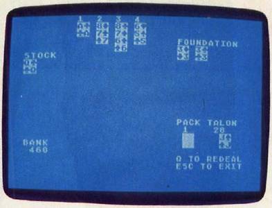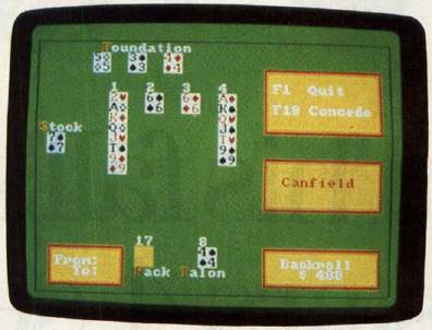 This version of Canfield (Program 5) is written in BASIC. Type it in and save a copy before playing. Press Fl to quit. Press F10 to start a new game with a new deck.