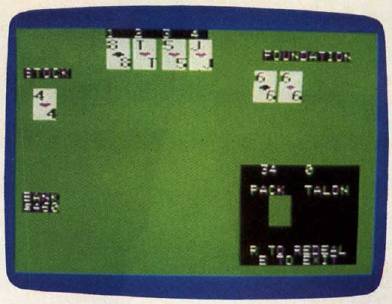 In the Atari version (Program 2), the four suits are all the same color, so you'll have to remember that hearts and diamonds are red, and clubs and spades are black. Press Escape to quit, and Q to start a new game with a new deck. This version of Canfield is written in BASIC. Type it in and save a copy before playing.