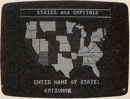 The information on each state and capital is stored in four arrays of 48 elements each. This information includes the x and y coordinates of a point within the state for the PAINT command, the name of the state, and the capital. The arrays are filled by simply READing the DATA statements that begin in line 840.