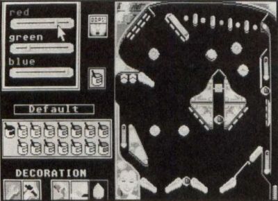 To create your own solid objects, or to beautify the board, Pinball Wizard's toolbox has a "Decoration and Obstacle" mode, a sort of stripped-down DEGAS where you can paint directly on the pinball layout in two modes. The first mode, used for decorating the play area, is "invisible" to the ball, which rolls over whatever was painted in this mode as if it weren't there. In the second mode, you can actually add, via "paintbrush," non-scoring parts the ball cannot pass through. This lets you create all manner of barriers, including shoots, slides and any other type of construction you may need.