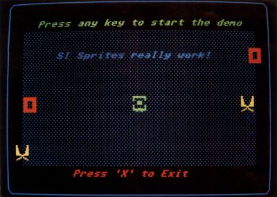 The demo program SPRITES is set up to use the low-resolution screen of the ST, although it will work in medium resolution. The program starts by drawing three stationary sprites of differing colors in the middle of the screen and two movable sprites in opposite corners of the screen. A prompt will then appear asking you to press any key to start the demo. After pressing a key, the two moveable sprites will begin to travel smoothly across the screen in opposite directions. They will continue to loop like that for about two minutes, and then you will be asked to press "X" to exit the program.
