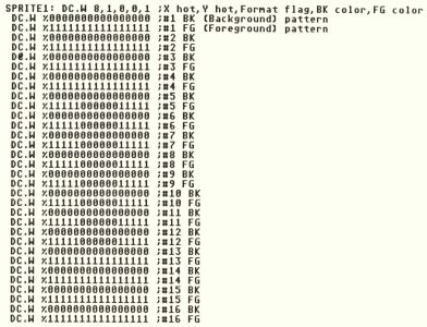 Words 4 and 5 of the sprite definition block as stated before specify the sprite's background color and foreground color, respectively. The background (BK), color for the sprites should be set to a value of 0 or else the sprite will appear as your bit pattern design imprinted upon the top of a colored square. The foreground (FG) color can have any value between 1 and 15 depending upon which screen resolution you are currently using. The remaining 32 words of the sprite definition block contain the bit pattern for the image you want to display. Here's an example of a sprite definition block: