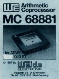 Weide Elektronik is a West German company that makes a 68881 math coprocessor add-on board for the ST. The board fits inside a 520 or 1040 case; so it must be installed by a dealer or technical person. The software library that comes with the add-on supports Megamax C, Mark Williams C, DRI C, Lattice C, Prospero, Fortran 77, Module II and CCD Pascal. Michtron supplied ST-Log with a copy of the Weide board, so they will most likely market it domestically.