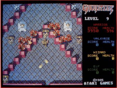 Gauntlet offers one- or two-player play, with the two-player mode allowing both players to work together to achieve the highest score possible. And getting a high score is about the only goal in this game. What that means is that you have to wander around each level of the dungeon maze, gathering treasures and fighting off billions of bad guys. There's food scattered about to help you keep your energy up, and the lucky adventurer will also stumble upon potions that may be used to help destroy the attacking creatures.