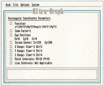 Ultra-Graph is a two- and three-dimensional graphing program. Despite the complexity usually associated with powerful graphing program, Ultra-Graph is relatively easy to use and understand, because we have gone to great lengths to make sure that complex calculations are not required to operate the program. In fact, Ultra-Graph is almost fully automated.