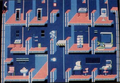 Elvin has filled his fortress with many obstacles and implements of destruction; his best shot to keep you away from his control room. A slew of robot warriors pace back and forth through each room, protecting all the pieces of the puzzle you have to gather. You'll have to search behind each chair, picture frame and, most of all, locked safes (where the music is stored), to keep your quest alive. Hidden by these items, you'll find such necessities as mines (to take out the robots and blast holes in the floor), light bulbs (to illuminate darkened rooms) and bombs (for blasting open a safe).