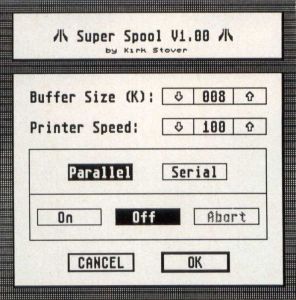 To use the Super Spool accessory, it must be on your startup disk at boot time. Clicking the mouse on "Super Spool" in the Desk menu will bring up the dialog box showing the default configuration values. The spooler defaults to a buffer size of 8K, a print speed of 100 characters per second and printer buffering turned off.