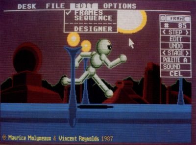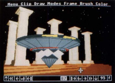 Cyber Paint is really a complex paint-box utility that stores a series of "frames" by comparing each to the one preceding it and storing only the differences. It can import animations created with CAD-3D (low-resolution files only; no monochrome), in addition to creating its own from scratch. Its tools include special effects used for, among other things, moving, sizing and rotating images or parts of images. Cyber Paint's real advantage is that its "changes only" method of storage makes it one of the fastest playback systems available. In fact, it has some limited capabilities to import/export data from/to Animator ST. Film Director animations can also be imported through a very laborious process of saving out frames of an animation as pictures, converting them to either NEO or DEGAS format and reconstructing them in Cyber Paint.