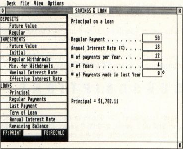 Loaded as an accessory, SAVELOAN can be called from the desktop. Offered are 14 financial programs grouped in three categories: deposits, investments and loans. The left side of the screen displays the 14 routines, that are chosen with the mouse. When the choice is made, the right portion of the screen is blanked and the appropriate prompts are offered. The program I used was labeled "Principal" within the "Loans" section.