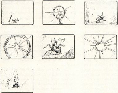 Consider that in the dramatic approach the ant's fate is preordained, and it has no control over any part of what happens. In the comic idea the ant's fate is sealed because instead of running away, he strikes back, causing the magnifying glass to be dropped on it. Its action results in a reaction. Action: it bites. Reaction: the magnifying glass drops on it. In this way the ant is a participant in the story, not a passive target.