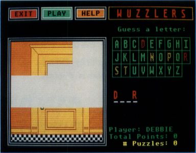 Wuzzlers is a version of Hangman, but with a twist: A piece of a picture puzzle is displayed for each word. If the user guesses a letter that is not in the word, another piece of the puzzle is displayed. The developing picture reminds the player that his guesses are running out and provides a hint as to what the mystery word could be. Thus, the "hangman"—in this case, the puzzle—is not simply a foreteller of doom but rather an aid that increases the likelihood of success.