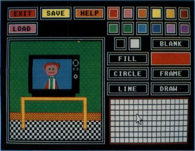 Click "Make a Puzzle." The file-creation screen will appear. This subprogram allows you to develop and alter puzzle files for use with the game. Options on this screen include EXIT, SAVE, HELP, LOAD and a variety of drawing options. Use the mouse to select colors, drawing options, fill patterns and magnify mode. A white "easel" is on the left half of the screen. Drawing and filling are achieved by simply pressing either mouse button while the mouse is on the easel.