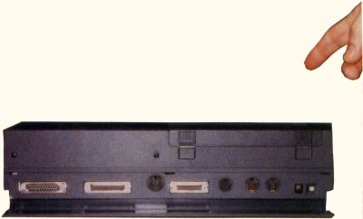 Several bus expansion plugs have been designed into Stacy, and removable plastic doors protect the machine from the elements. The rear panel protects the connector plugs for printers, modems, external hard disks, external floppy disks and RGB or monochrome monitor hookup. The rear panel doubles as a rear stand, positioning Stacy toward the user.