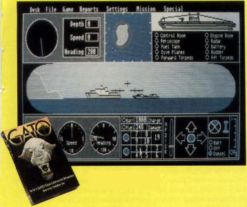 As I found with all these games, Gato is an easy-to-learn and easy-to-play simulation. Upon booting you choose a torpedo-to-mine ratio, which determines your allocation of armaments. Other game settings are accessed via a pulldown menu, and you can control the general level of difficulty, as well as adjust some of the characteristics of enemy ships (speed and aggressiveness) and of your sub (speed, rate of resource consumption and hull strength). All of these can also be changed during play, although the general level of play cannot be varied during enemy engagement.