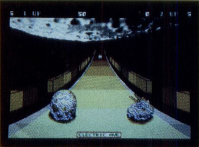 Roadwars is visually intriguing; no one can take that away. This is what I would imagine a Zaxxon 3D to look like—without the special glasses, that is. The top half of the screen is dominated by the moon that the player is traveling toward. The balance of the screen displays the current roadway in three-dimensional perspective. There are panels that line the outside edges of the roadways. These serve as barriers that keep you from falling off the roadway but, more importantly, provide the illusion of forward motion, like Pole Position's road lines that move toward the player.