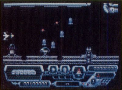 The upper three-quarters of the screen is where all the action takes place. A player's up and down movements are severely limited in such a compressed action area, especially since contact with any of the space station's installations is instant death. However, that isn't a complaint; this limited movement actually adds to the overall feeling of the game.