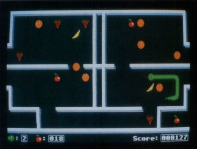 In Experiment 42, you control Edwin the Mutant Snake with a joystick plugged into the ST's joystick port. You navigate him through several laboratory mazes, eating prizes and avoiding dead ends. When you eat a prize—various fruits and other foods—Edwin's body will spend a short time digesting it, then he will grow by one body segment. The more prizes you eat, the longer Edwin grows, up to a set maximum for each level.