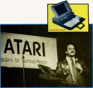 The Transportable (previously named Stacy), the new ST laptop computer from Atari, made its first public appearance. One prototype unit was shown (at arm's length) running a simple slide-show program. The Transportable is a battery-powered 1040 ST computer with monochrome display, and includes a trakball, which substitutes for the mouse, on the right of the full-size QWERTY keyboard. The supertwist LCD display folds down over the keyboard for portability. The unit weighs less than 15 lbs. with batteries installed, and one charge lasts over five hours with medium disk use. Joe Mendolia, Atari's vice president of Marketing, promised the enthusiastic crowd that the Transportable will begin shipping by the end of the summer.