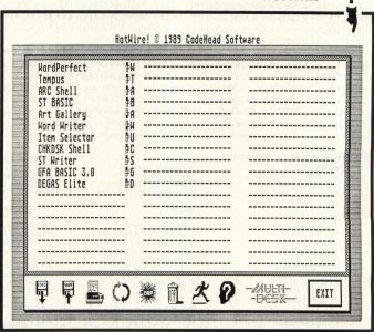 HotWire finds applications hidden in folders, no matter where they reside, with the HotWire menu displaying up to 54 programs at once and showing hot-key icons and 20-character application descriptions. The program, written completely in fast, compact assembly language, uses 40K of your ST's memory.